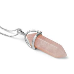 Een edelsteen hanger van Rozenkwarts, een dubbeleinder met een zilverkleurige houder inclusief zilveren collier.